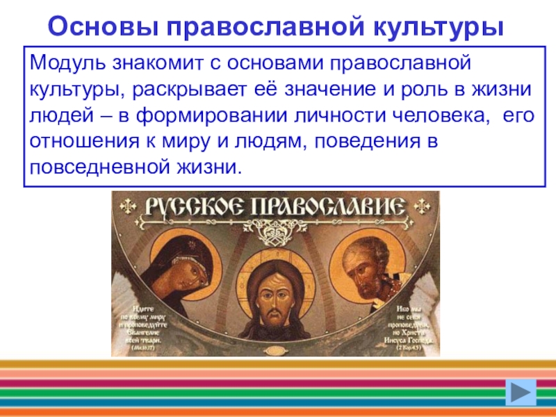 Модуль знакомит с основами православной культуры, раскрывает её значение