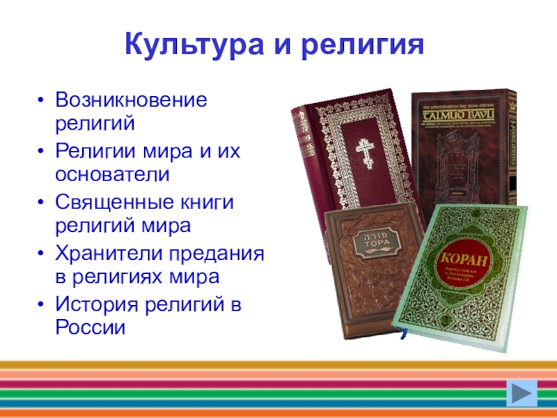 Культура и религия Возникновение религийРелигии мира и их основатели Священные книги религий мира Хранители предания в религиях