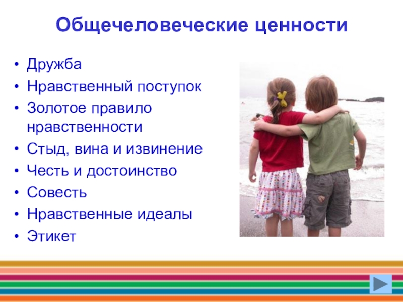 Общечеловеческие ценностиДружбаНравственный поступок Золотое правило нравственностиСтыд, вина и извинение Честь и достоинство Совесть Нравственные идеалы Этикет