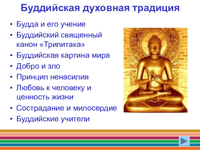 Буддийская духовная традиция Будда и его учениеБуддийский священный канон «Трипитака»Буддийская картина мираДобро и злоПринцип ненасилияЛюбовь к человеку