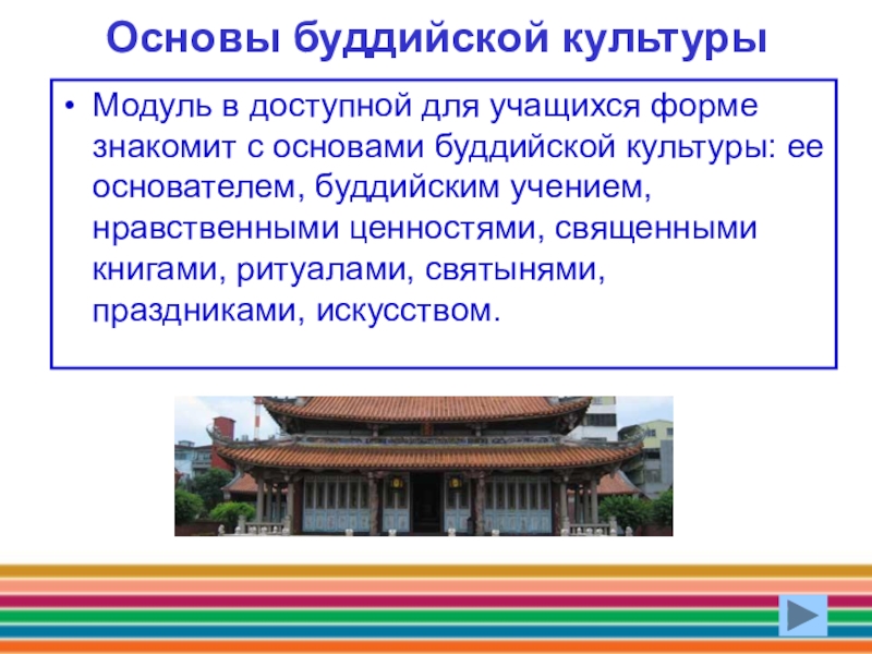 Основы буддийской культурыМодуль в доступной для учащихся форме знакомит с основами буддийской культуры: ее основателем, буддийским учением,