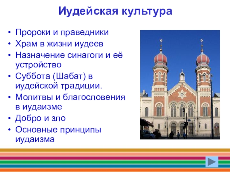 Иудейская культура Пророки и праведникиХрам в жизни иудеевНазначение синагоги и её устройствоСуббота (Шабат) в иудейской традиции.Молитвы и
