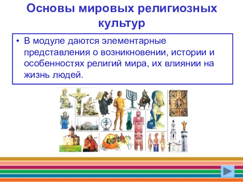 Основы мировых религиозных культурВ модуле даются элементарные представления о возникновении, истории и особенностях религий мира, их влиянии