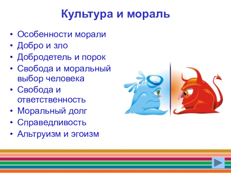 Культура и мораль Особенности морали Добро и злоДобродетель и порок Свобода и моральный выбор человекаСвобода и ответственностьМоральный