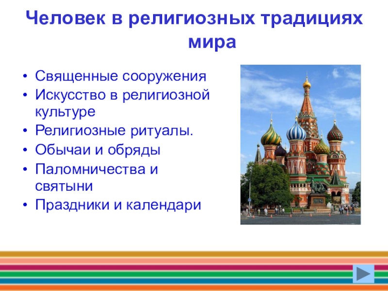 Человек в религиозных традициях мираСвященные сооружения Искусство в религиозной культуре Религиозные ритуалы.Обычаи и обряды Паломничества и святыни
