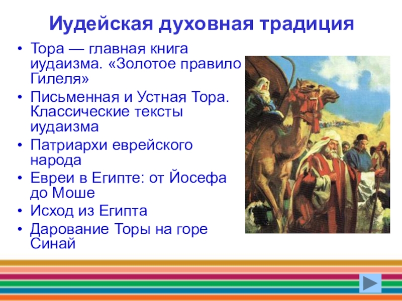 Иудейская духовная традиция Тора — главная книга иудаизма. «Золотое правило Гилеля»Письменная и Устная Тора. Классические тексты иудаизмаПатриархи