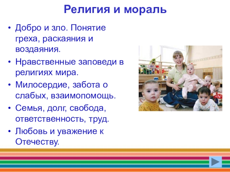 Религия и моральДобро и зло. Понятие греха, раскаяния и воздаяния. Нравственные заповеди в религиях мира. Милосердие, забота