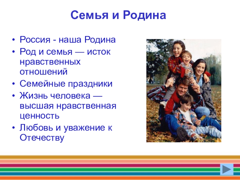 Семья и РодинаРоссия - наша Родина Род и семья — исток нравственных отношений Семейные праздники Жизнь человека