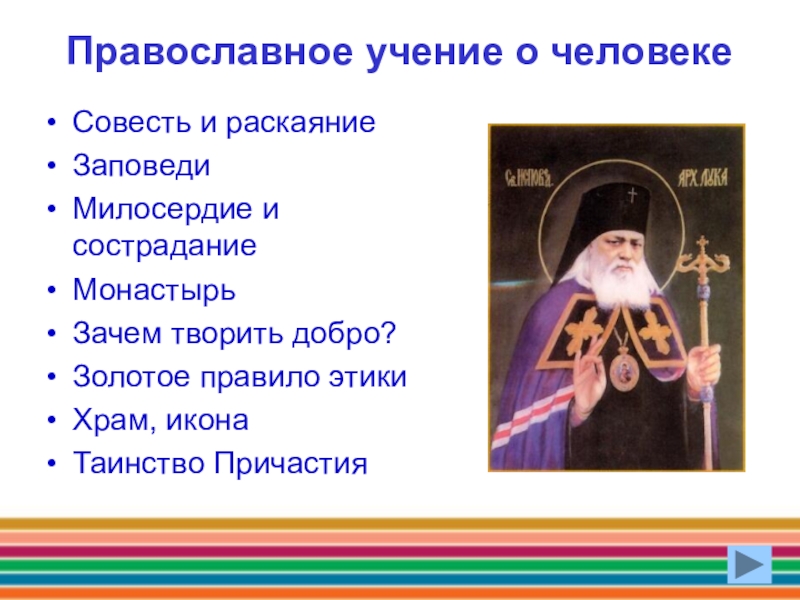 Православное учение о человекеСовесть и раскаяниеЗаповеди Милосердие и состраданиеМонастырьЗачем творить добро? Золотое правило этикиХрам, икона Таинство Причастия