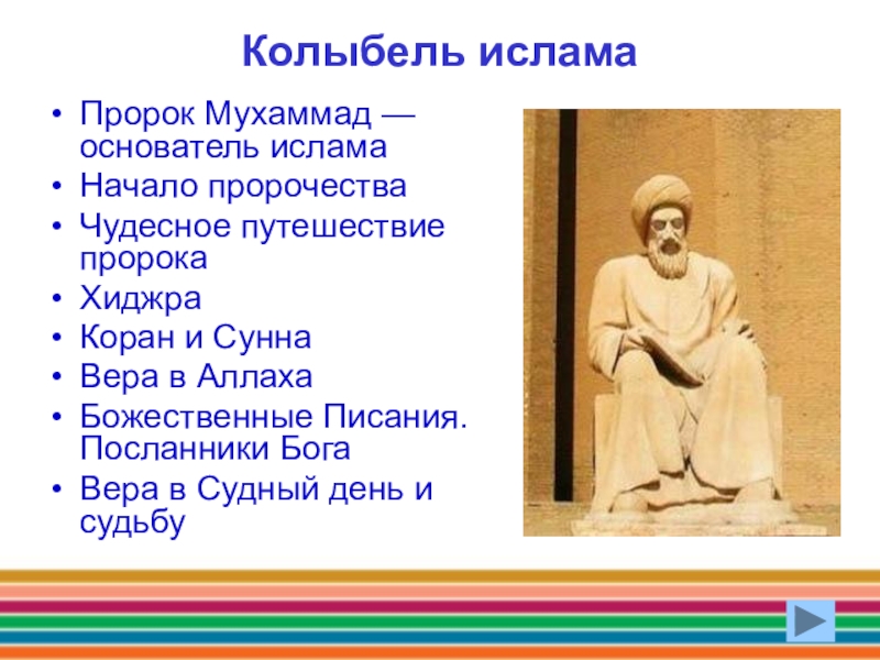 Колыбель исламаПророк Мухаммад — основатель исламаНачало пророчестваЧудесное путешествие пророкаХиджраКоран и СуннаВера в АллахаБожественные Писания. Посланники БогаВера в