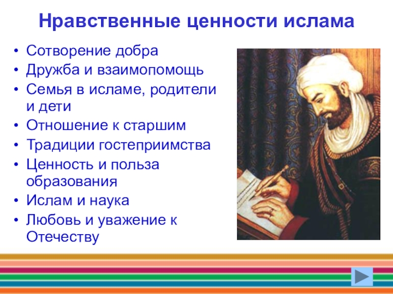 Нравственные ценности исламаСотворение добраДружба и взаимопомощьСемья в исламе, родители и детиОтношение к старшимТрадиции гостеприимстваЦенность и польза образованияИслам