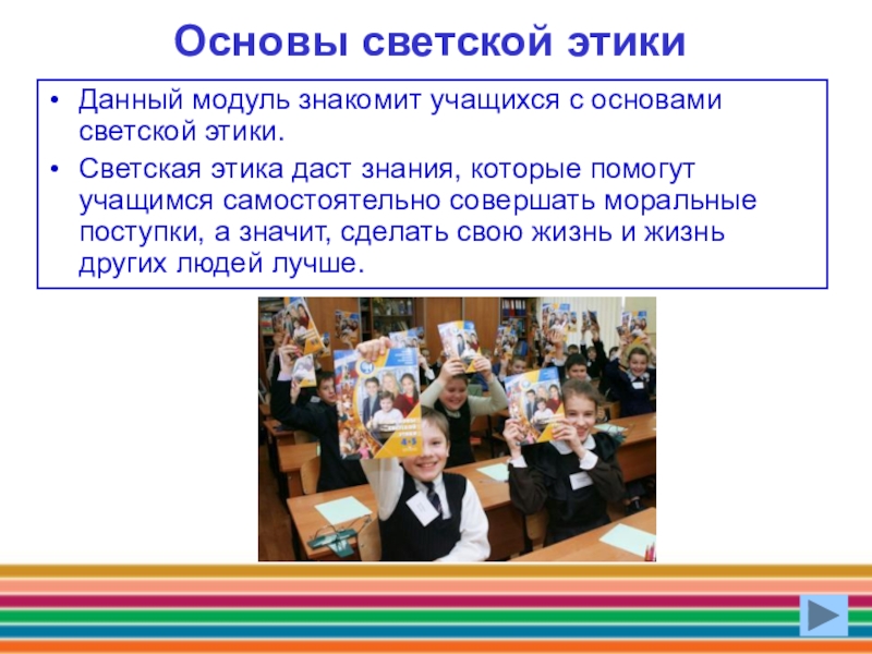 Основы светской этикиДанный модуль знакомит учащихся с основами светской этики. Светская этика даст знания, которые помогут учащимся
