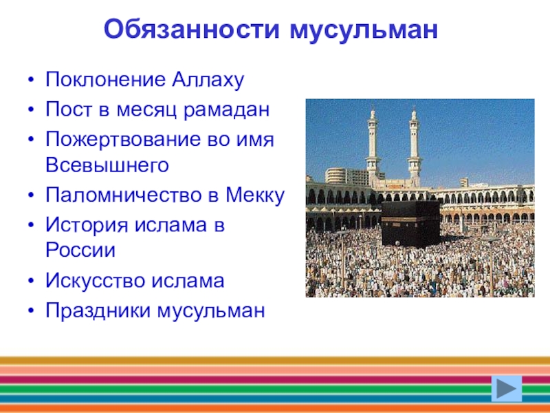 Обязанности мусульманПоклонение АллахуПост в месяц рамаданПожертвование во имя ВсевышнегоПаломничество в МеккуИстория ислама в РоссииИскусство исламаПраздники мусульман