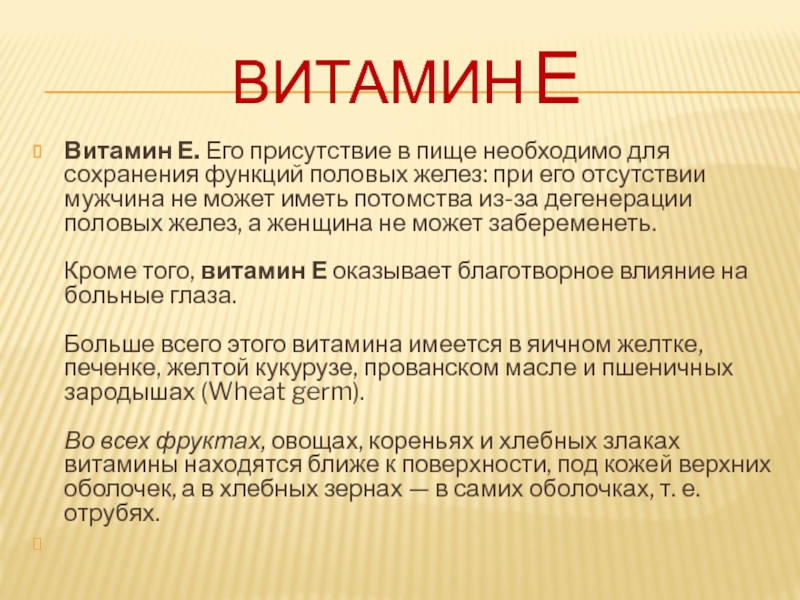 Витамин Е. Его присутствие в пище необходимо для сохранения функций