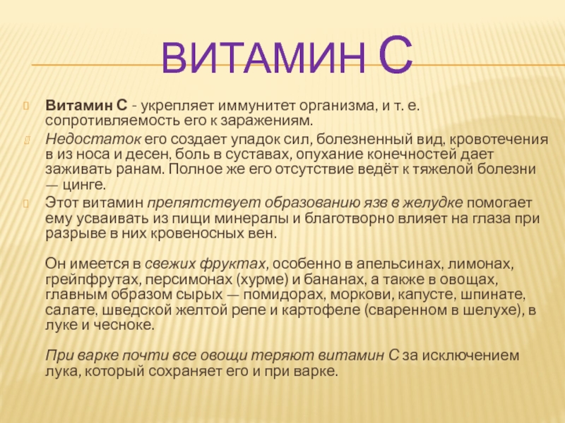 Недостаток его создает упадок сил, болезненный вид, кровотечения в из носа и десен, боль в суставах, опухание конечностей дает заживать ранам. Полное же его отсутствие ведёт к тяжелой болезни — цинге.