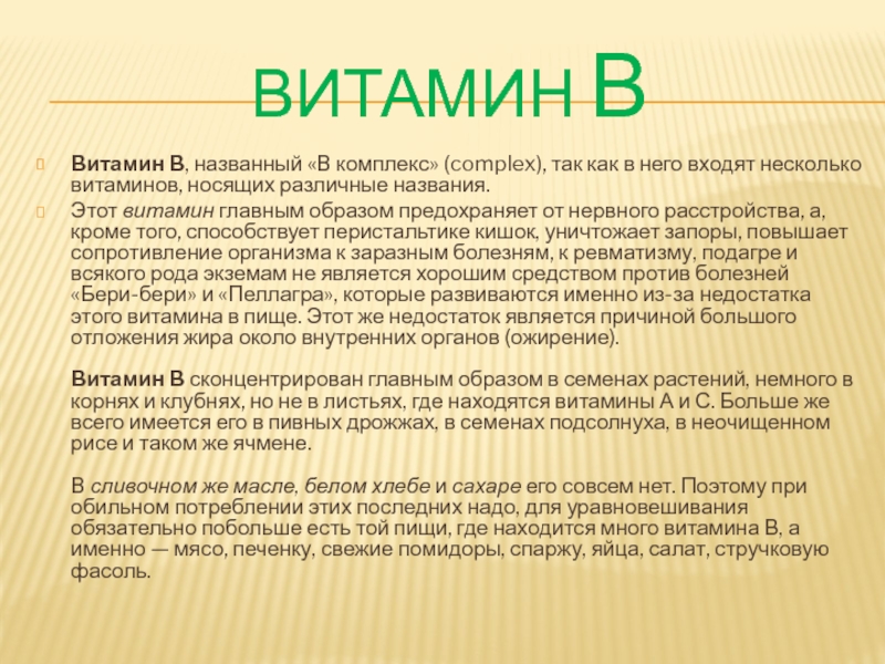 В сливочном же масле, белом хлебе и сахаре его совсем нет. Поэтому при обильном потреблении этих последних надо, для уравновешивания обязательно побольше есть той пищи, где находится много витамина В, а именно — мясо, печенку, свежие помидоры, спаржу, яйца, салат, стручковую фасоль.