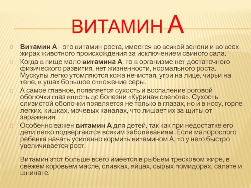 Особенно важен витамин А для детей, так как при недостатке его дети легко подвергаются всяким заболеваниям. Если малорослого ребенка начать усиленно кормить витамином А, то у него быстро увеличивается рост.