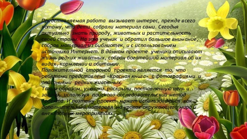 Положительной стороной проекта является то, что ребятами представлена «Красная книга» с фотографиями и описаниями редких животных.