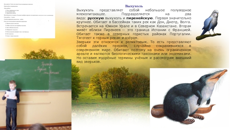 Выхухоль представляет собой небольшое полуводное млекопитающее. Подразделяется на два вида: русскую выхухоль и пиренейскую.