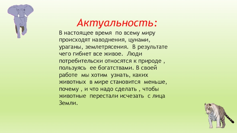 В результате чего гибнет все живое. Люди потребительски относятся к природе , пользуясь ее богатствами. В своей работе мы хотим узнать, каких животных в мире становится меньше, почему , и что надо сделать , чтобы животные перестали исчезать с лица Земли.