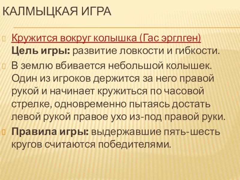 Калмыцкая игрАКружится вокруг колышка (Гас эрглген) Цель игры: развитие ловкости и гибкости.В землю вбивается небольшой колышек. Один из