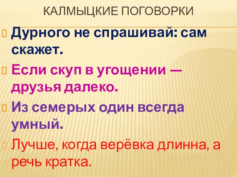 Калмыцкие пОГОВОРКИДурного не спрашивай: сам скажет.Если скуп в угощении — друзья далеко.Из семерых один всегда умный.Лучше, когда