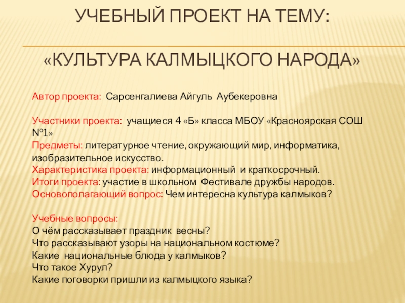 Учебный проект на тему: «Культура калмыцкого народа»Автор проекта: Сарсенгалиева Айгуль АубекеровнаУчастники проекта: учащиеся 4 «Б» класса МБОУ «Красноярская СОШ №1»Предметы: литературное чтение, окружающий мир, информатика, изобразительное искусство.Характеристика проекта: информационный и краткосрочный.Итоги проекта: участие в