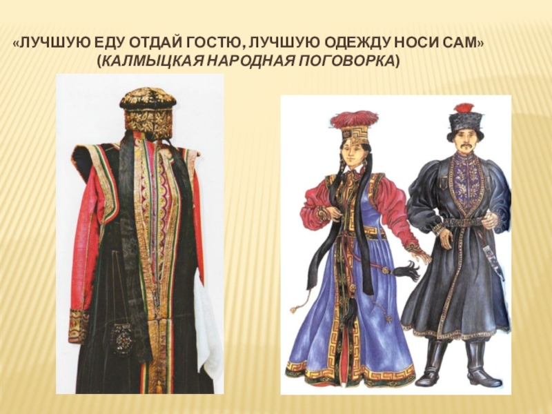 Слайд 4«Лучшую еду отдай гостю, лучшую одежду носи сам» (калмыцкая народная поговорка)