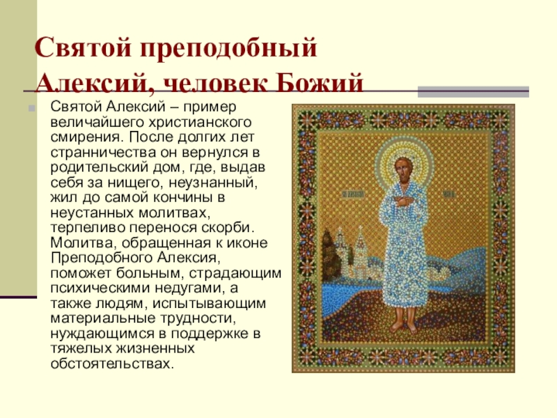 После долгих лет странничества он вернулся в родительский дом, где, выдав себя за нищего, неузнанный, жил до самой кончины в неустанных молитвах, терпеливо перенося скорби. Молитва, обращенная к иконе Преподобного Алексия, поможет больным, страдающим психическими недугами, а также людям, испытывающим материальные трудности, нуждающимся в поддержке в тяжелых жизненных обстоятельствах.