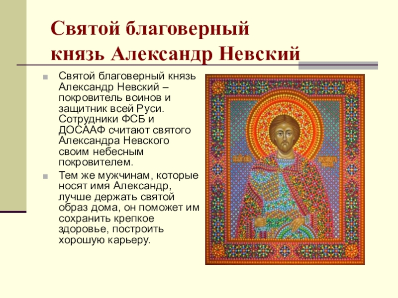 покровитель воинов и защитник всей Руси. Сотрудники ФСБ и ДОСААФ считают святого Александра Невского своим небесным покровителем.