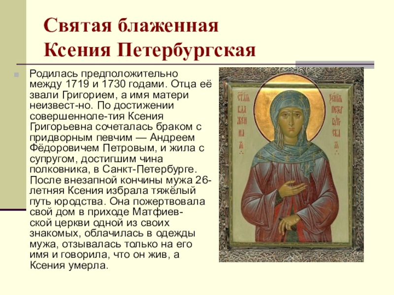 её звали Григорием, а имя матери неизвест-но. По достижении совершенноле-тия Ксения Григорьевна сочеталась браком с придворным певчим — Андреем Фёдоровичем Петровым, и жила с супругом, достигшим чина полковника, в Санкт-Петербурге. После внезапной кончины мужа 26-летняя Ксения избрала тяжёлый путь юродства. Она пожертвовала свой дом в приходе Матфиев-ской церкви одной из своих знакомых, облачилась в одежды мужа, отзывалась только на его имя и говорила, что он жив, а Ксения умерла.