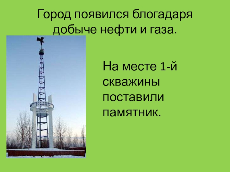 Слайд 5Город появился блогадаря добыче нефти и газа.