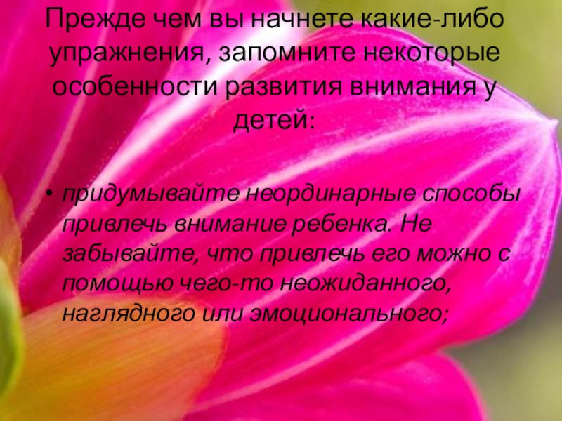 придумывайте неординарные способы привлечь внимание ребенка. Не забывайте, что привлечь его можно с помощью чего-то неожиданного, наглядного или эмоционального;