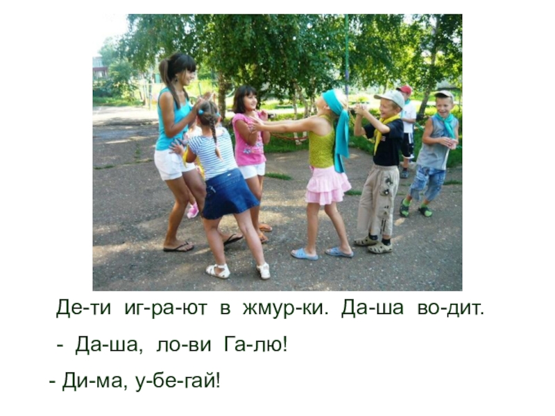 Де-ти иг-ра-ют в жмур-ки. Да-ша во-дит.- Да-ша, ло-ви Га-лю! Ди-ма, у-бе-гай!