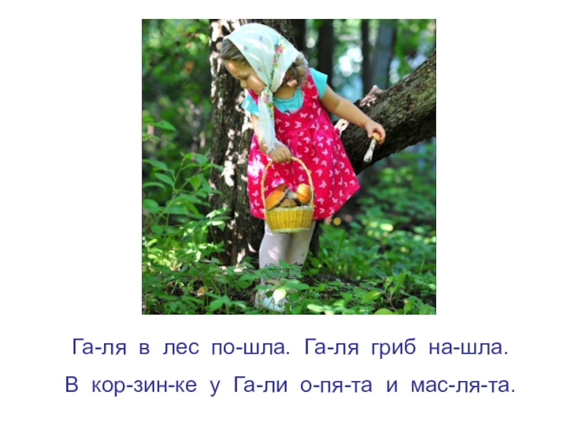 Га-ля в лес по-шла. Га-ля гриб на-шла.В кор-зин-ке у Га-ли о-пя-та и мас-ля-та.