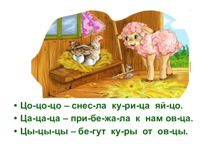 Цо-цо-цо – снес-ла ку-ри-ца яй-цо.Ца-ца-ца – при-бе-жа-ла к нам ов-ца.Цы-цы-цы – бе-гут ку-ры от ов-цы.