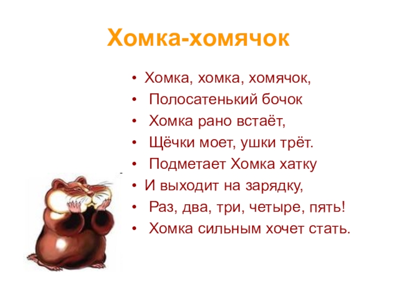 Хомка-хомячокХомка, хомка, хомячок, Полосатенький бочок Хомка рано встаёт, Щёчки моет, ушки трёт. Подметает Хомка хатку И выходит