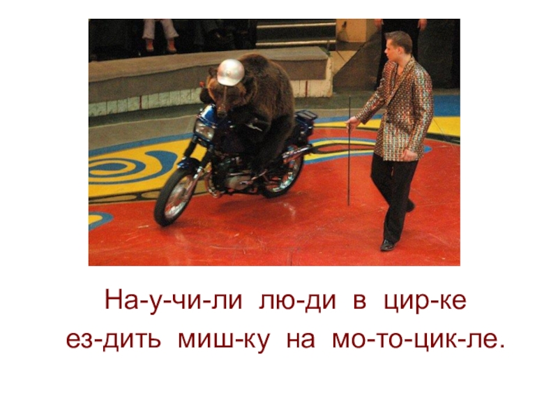 На-у-чи-ли лю-ди в цир-ке ез-дить миш-ку на мо-то-цик-ле.