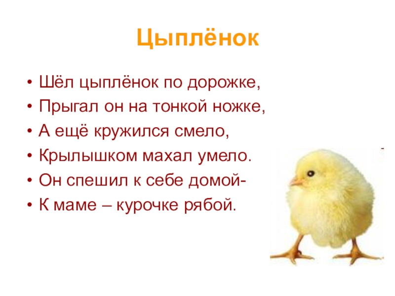 Цыплёнок Шёл цыплёнок по дорожке,Прыгал он на тонкой ножке, А ещё кружился смело,Крылышком махал умело.Он спешил к