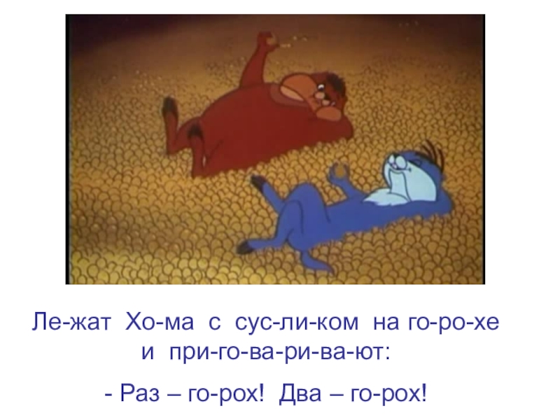 Ле-жат Хо-ма с сус-ли-ком на го-ро-хе и при-го-ва-ри-ва-ют:- Раз – го-рох! Два – го-рох!