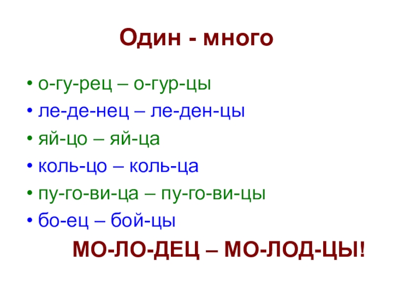 Один - многоо-гу-рец – о-гур-цыле-де-нец – ле-ден-цыяй-цо – яй-цаколь-цо – коль-цапу-го-ви-ца – пу-го-ви-цыбо-ец – бой-цы