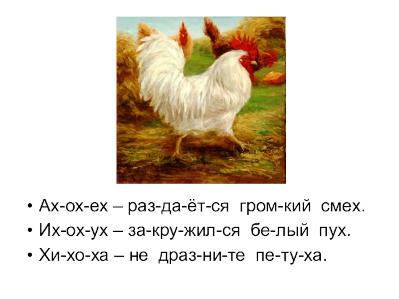 Ах-ох-ех – раз-да-ёт-ся гром-кий смех.Их-ох-ух – за-кру-жил-ся бе-лый пух.Хи-хо-ха – не драз-ни-те пе-ту-ха.