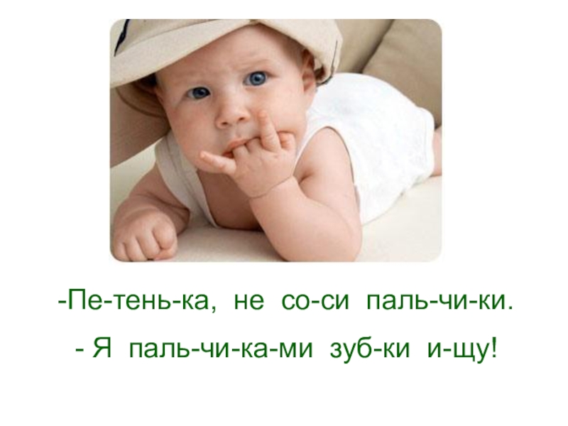 Пе-тень-ка, не со-си паль-чи-ки. Я паль-чи-ка-ми зуб-ки и-щу!