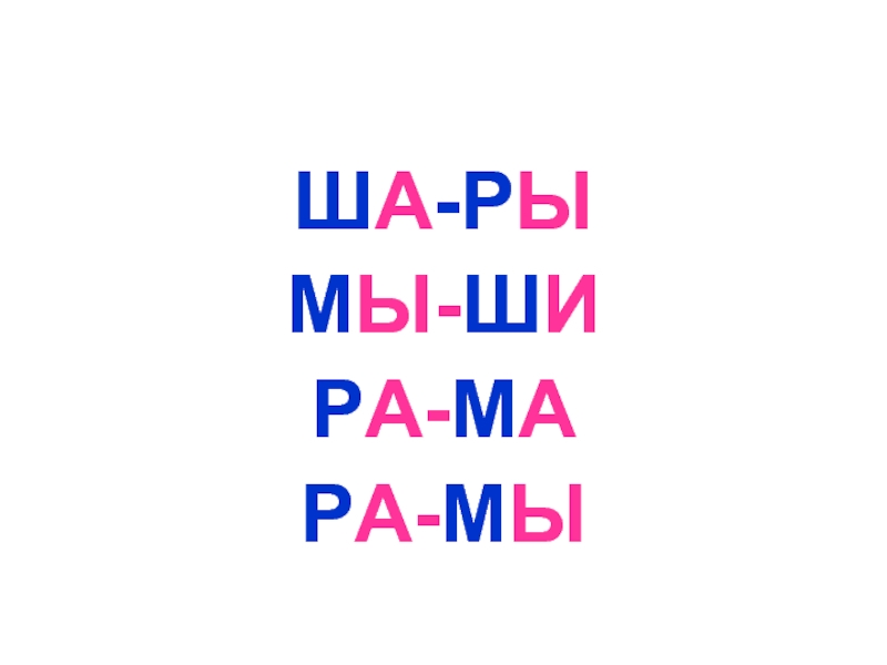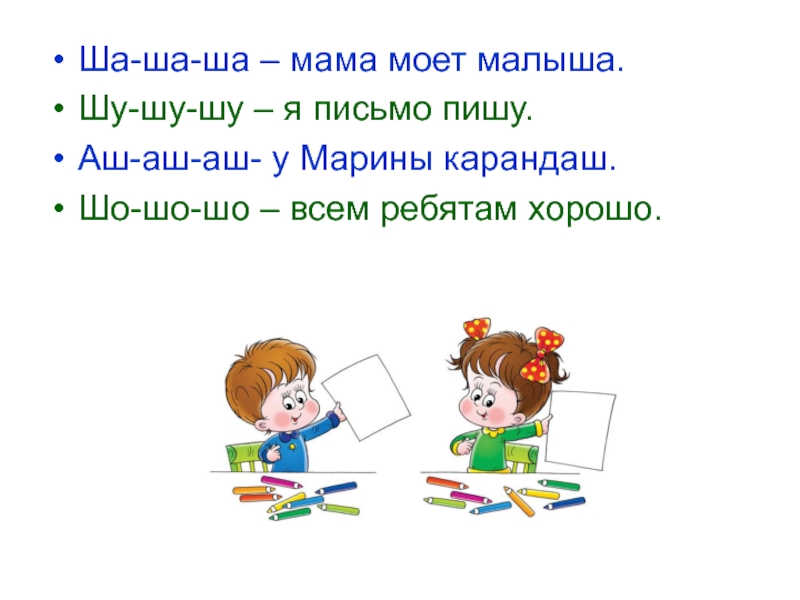 Ша-ша-ша – мама моет малыша.Шу-шу-шу – я письмо пишу.Аш-аш-аш- у Марины карандаш.Шо-шо-шо – всем ребятам хорошо.