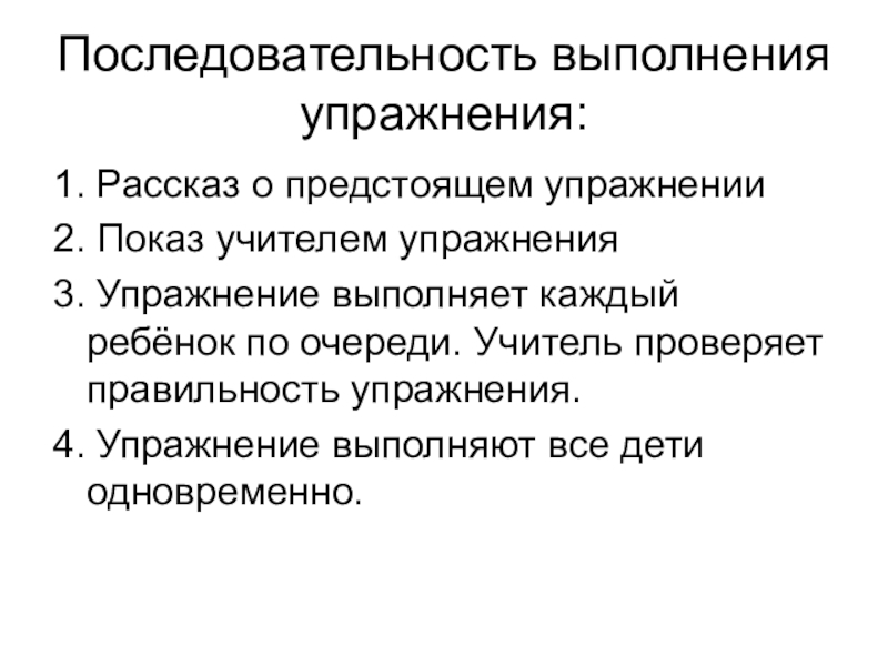 Последовательность выполнения упражнения:1. Рассказ о предстоящем упражнении2. Показ учителем упражнения3. Упражнение выполняет каждый ребёнок по очереди. Учитель