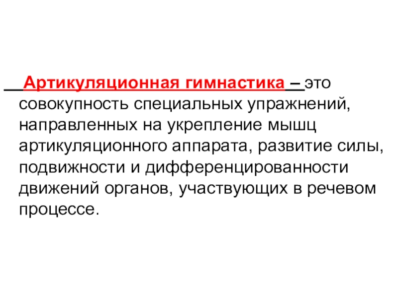 Артикуляционная гимнастика – это совокупность специальных упражнений, направленных на укрепление мышц артикуляционного аппарата, развитие силы,