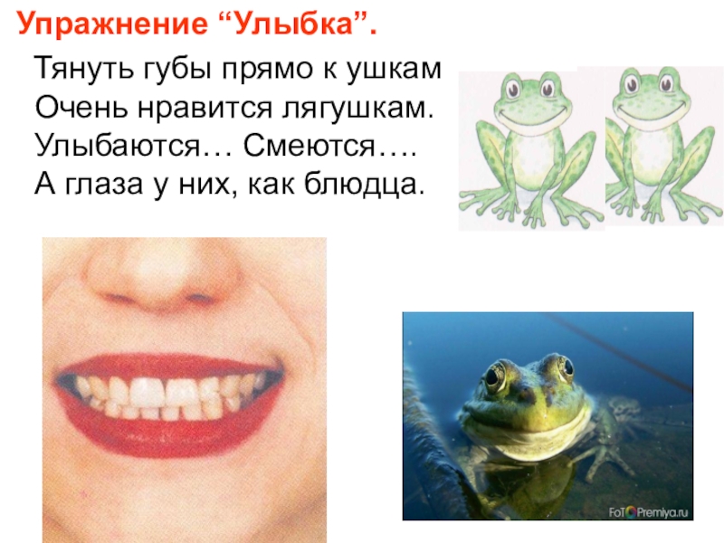 Упражнение “Улыбка”.  Тянуть губы прямо к ушкам Очень нравится лягушкам. Улыбаются… Смеются…. А глаза у
