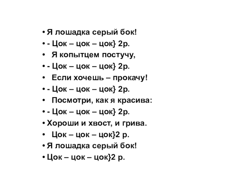Я лошадка серый бок!- Цок – цок – цок} 2р. Я копытцем постучу,- Цок – цок –