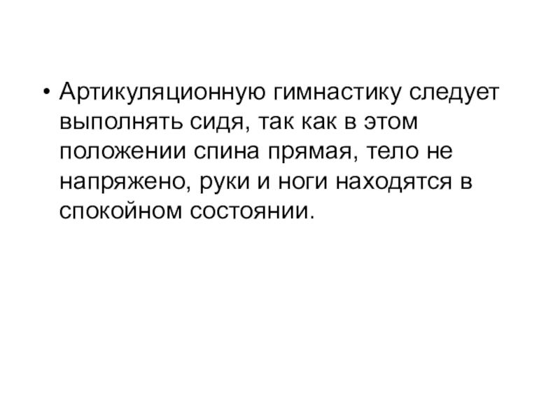 Слайд 4Артикуляционную гимнастику следует выполнять сидя, так как в этом положении спина