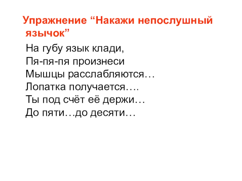 Упражнение “Накажи непослушный язычок”  На губу язык клади, Пя-пя-пя произнеси Мышцы расслабляются… Лопатка получается…. Ты